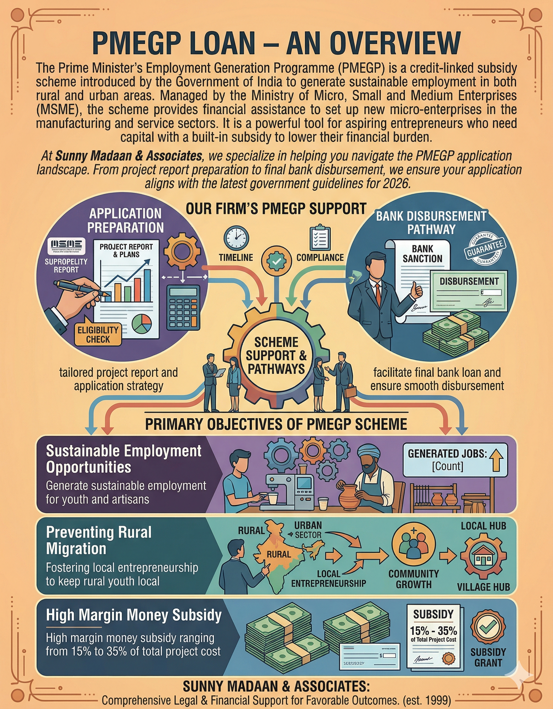 At Sunny Madaan & Associates, we specialize in helping you navigate the PMEGP application landscape. From project report preparation to final bank disbursement, we ensure your application aligns with the latest government guidelines for 2026.